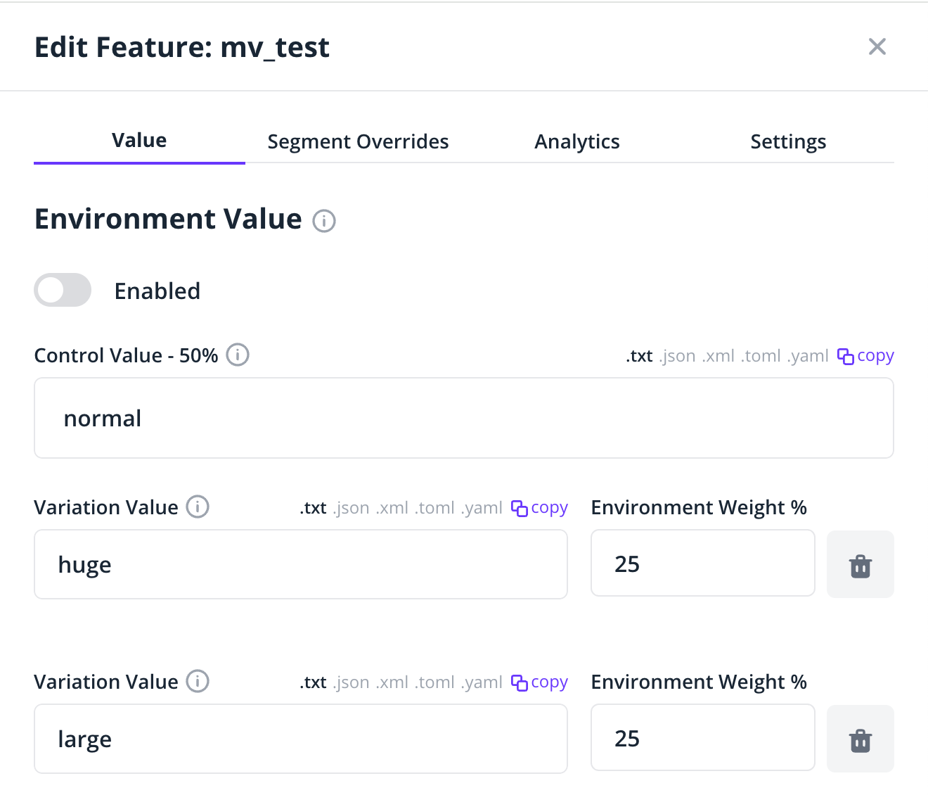 In the screenshot above, roughly half our user population will receive the value normal, roughly one quarter (25%) will receive large and roughly one quarter (25%) will receive huge. Note that you can use 100% as a weighting to ensure all your users receive the same variant.
